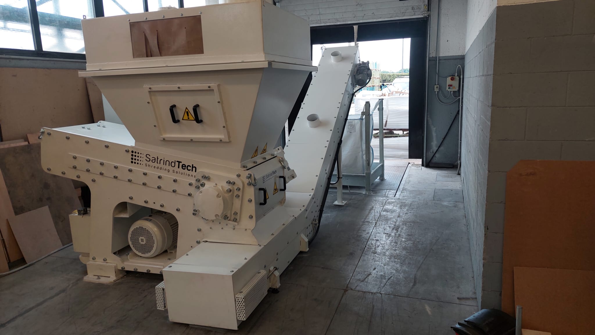 Glass fiber reinforced plastic is well-suited for recycling, allowing production waste to be reintroduced into the production cycle with clear economic and environmental benefits. An example is one of our leading clients in pultruded composite profiles production, where we installed a 22kW single-shaft shredder with a chair discharge belt, which discharges into a big-bag.